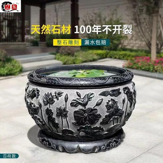 法漫玫石雕鱼缸花盆青石仿古水缸石头荷花缸户外石缸庭院圆形石槽摆件 青石雕刻荷花款 直径120厘米高7